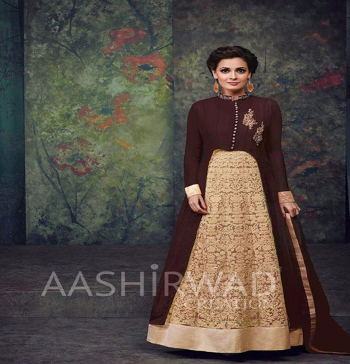Suit Features -Brown with Beige bottom Designer Embroidered Semi-Stitched Salwar Kameez made up of Georgette & net fabric with long sleeves.This readymade long dress can wear occasionally only .It can be stiched maximixe size upto 42 bust size. It will give you a smart & a party wear look, also make you feek stylish and comfortable. There might be some color variation.