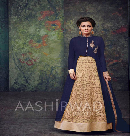 Suit Features -Navy with Beige bottom Designer Embroidered Semi-Stitched Salwar Kameez made up of Georgette & net fabric with long sleeves.This readymade long dress can wear occasionally only .It can be stiched maximixe size upto 42 bust size. It will give you a smart & a party wear look, also make you feek stylish and comfortable. There might be some color variation.