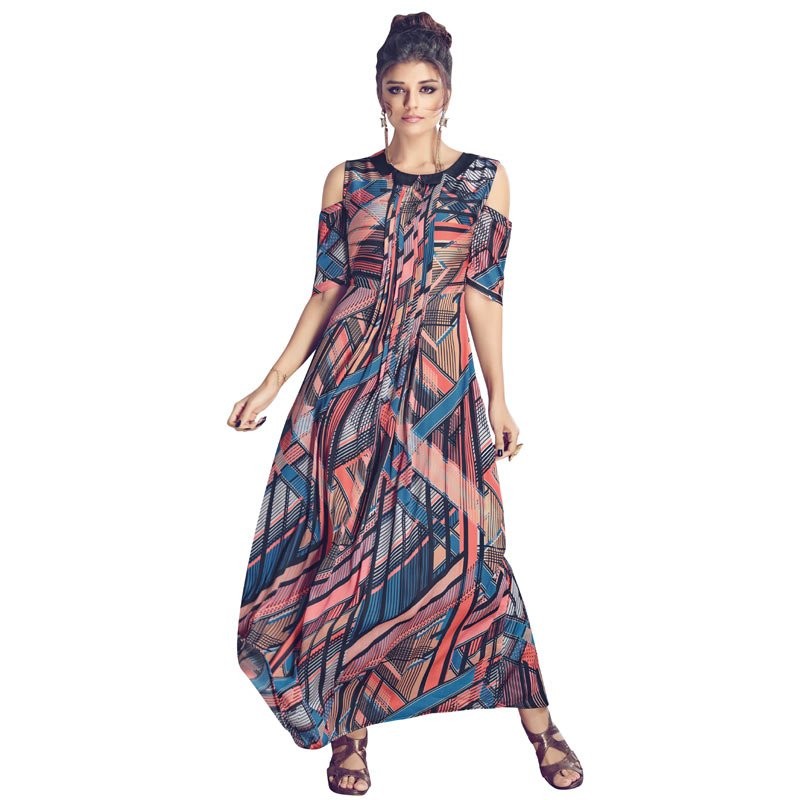 Look your best while heading out during the day by wearing this Dress. Crafted from modal & Crepe Georgette with a spread of a psychedelic abstract print that takes its stylish look up a notch.This dress will be a comfortable pick for sure as it is fashioned. Just team it with a pair of platforms to complete your effortlessly stylish look.