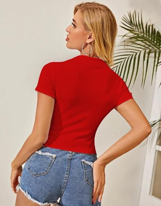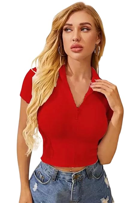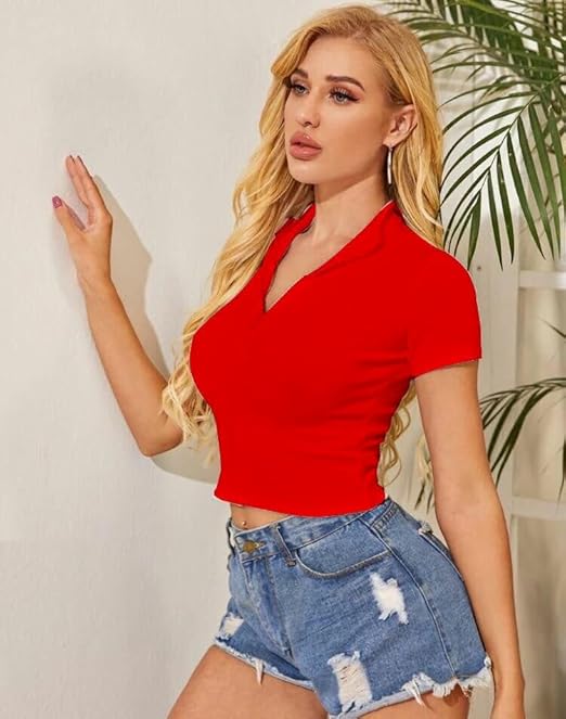 Women Collar V-Neck Red Crop Top.