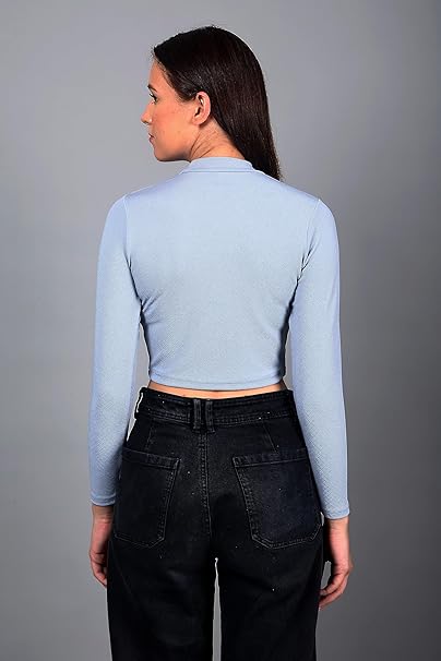 Women High Neck Light Blue Crop Top.
