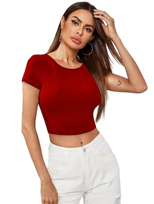 Women Short Sleeves Red Crop Top.