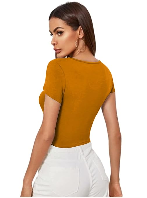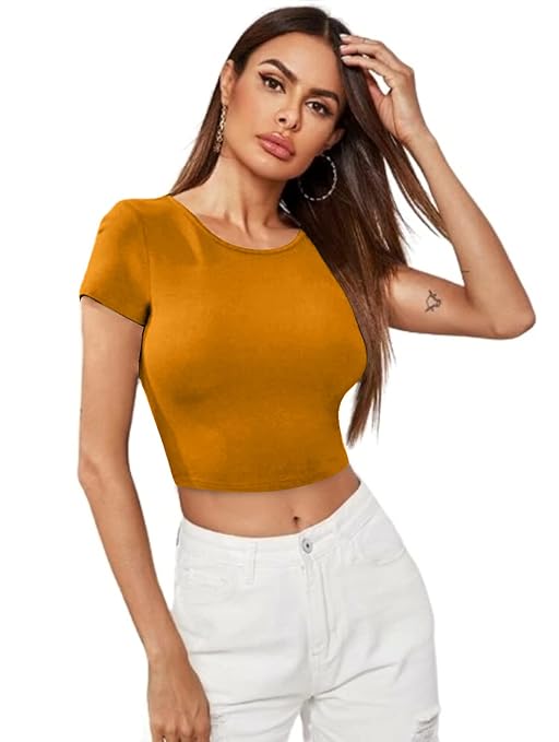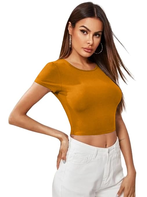 Women Short Sleeves Turmeric Yellow Crop Top.