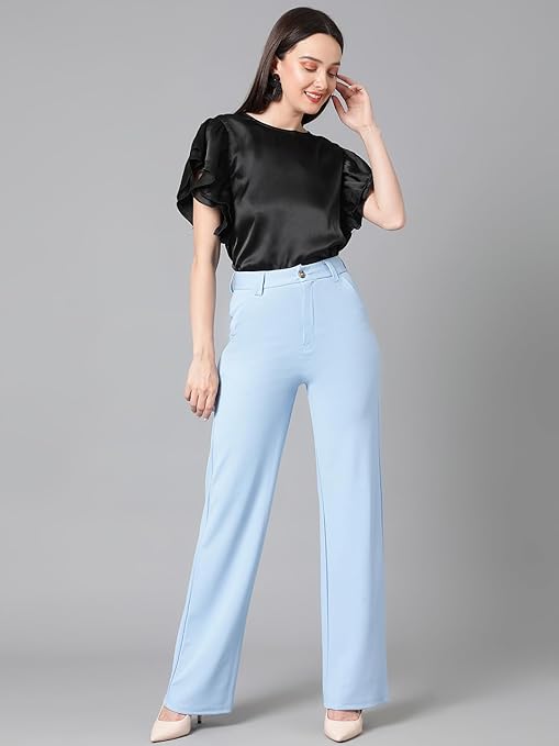 Women’s High Rise Sky Blue Cotton Fit Trousers.